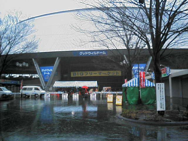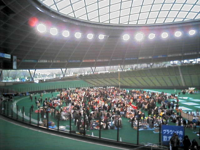 時間的にも昼飯時になったので、ドーム脇にある「獅子」という中華の店でバイキングをやっていたのでそこに向かう途中、3塁側スタンドの中段あたりからフリーマーケット全景を撮影したのがこれです。