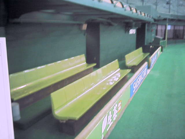 そして下の写真が1塁側のベンチ。野球は確か1塁側がホームですよね?だからこちらにいつも西武の選手が居るんでしょうねぇ~。写真で見るとそれなりに横幅(写真上では奥行き)があるようにを感じますが、肉眼で見た印象は「こんなに横幅が狭いの?」という感じでした。